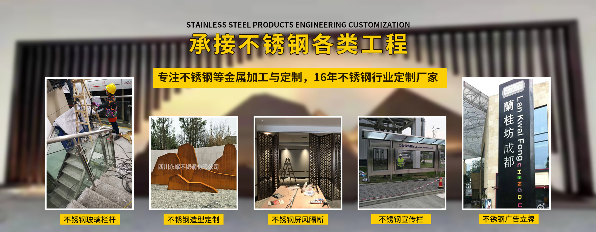 四川永耀不銹鋼有限公司是一家集開發(fā)、設計、加工、制作、安裝、并承接各種不銹鋼工程為一體的綜合性企業(yè)。多年來一直在專注于不銹鋼等金屬的加工與研發(fā)。在客戶群體中贏得了良好的聲譽,以專業(yè)專注的精神,致辭力于打造良好的產(chǎn)品和企業(yè)形象,對每一產(chǎn)品傾注全力,力爭每個細節(jié)精細,確保產(chǎn)品具有優(yōu)越的性能,優(yōu)美的外觀及優(yōu)良的品質(zhì),使公司產(chǎn)品深受廣大用戶的親睞。 本公司主要業(yè)務: 一、工程類 承攬:酒店、銀行、商鋪、寫字樓、公寓、城鐵、地鐵、公交、機關(guān)、 學校、廣場藝術(shù)雕塑、自動門、旋轉(zhuǎn)門、廣告欄、公